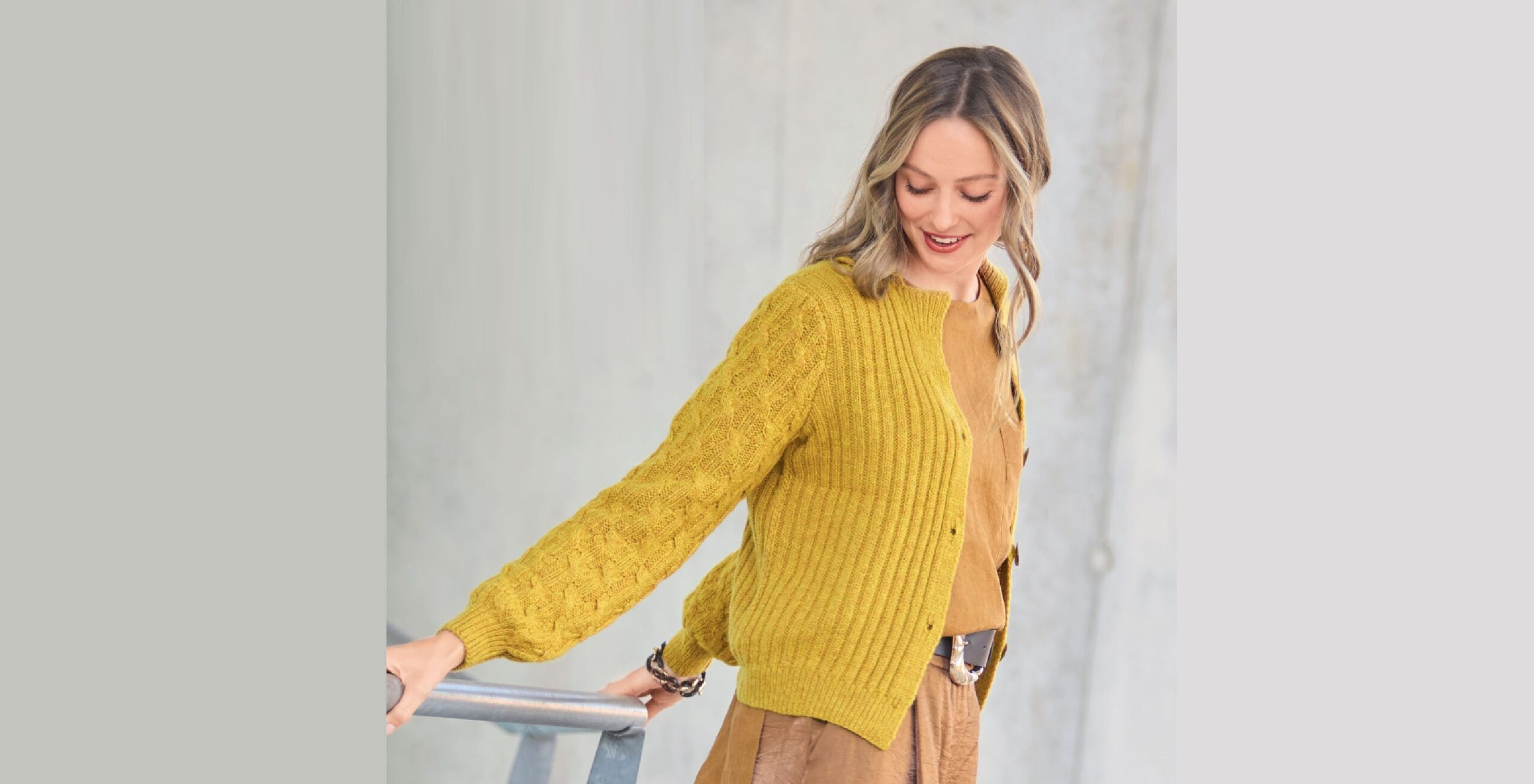 You will need: пряжа LANA GROSSA “Cool Merino”(90% шерсти, 10% полиамида; 150 м/50 г) -450 (450) 500 г цв. шафрана Safrangelb (Fb 035); спицы № 2,5 и 5; круговые спицы № 2,5; 4 пуговицы диаметром 26 мм.