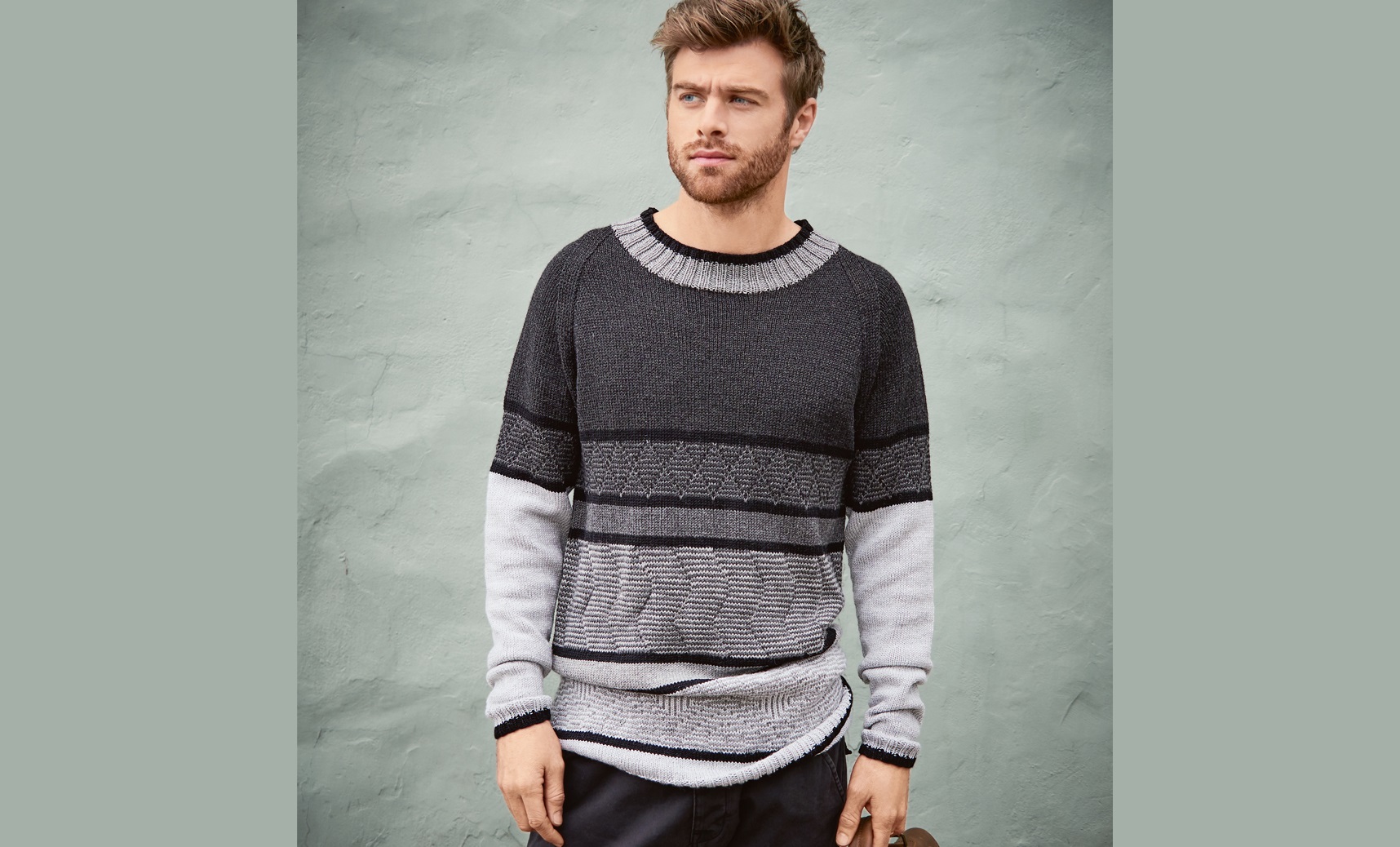 Сдержанная цветовая гамма и полосы геометрических узоров придают пуловеру благородный вид.