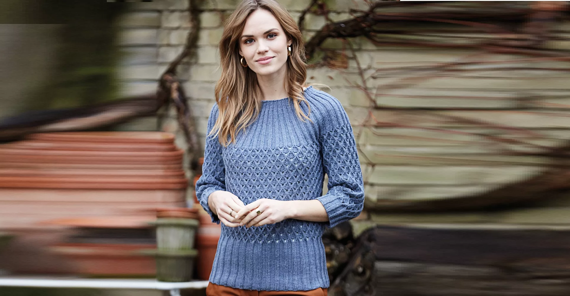 Этот великолепный джемпер хорошо сидит на фигуре благодаря кокетке в резинку. А сетчатый рельефный узор помогает создать женственный облик.
