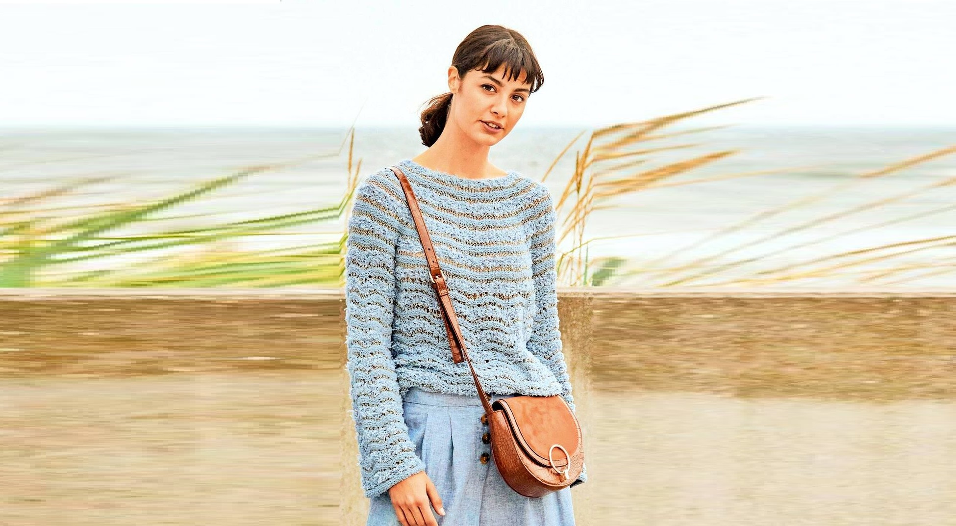 В этом слегка прозрачном пуловере с круглой кокеткой сочетается мягкая пряжа наподобие махровой, хлопковая пряжа и тон кая глянцевая ленточная пряжа. А волнообразный узор пуловера привносит некую динамичность.