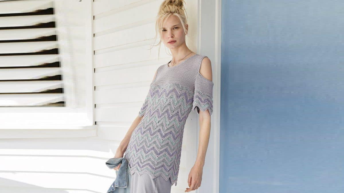 Сочетание мягких пастельных тонов уже само по себе радует глаз. Вдобавок к этому удлиненный пуловер восхищает узким силуэтом и эффектными вырезами, оголяющими плечи.