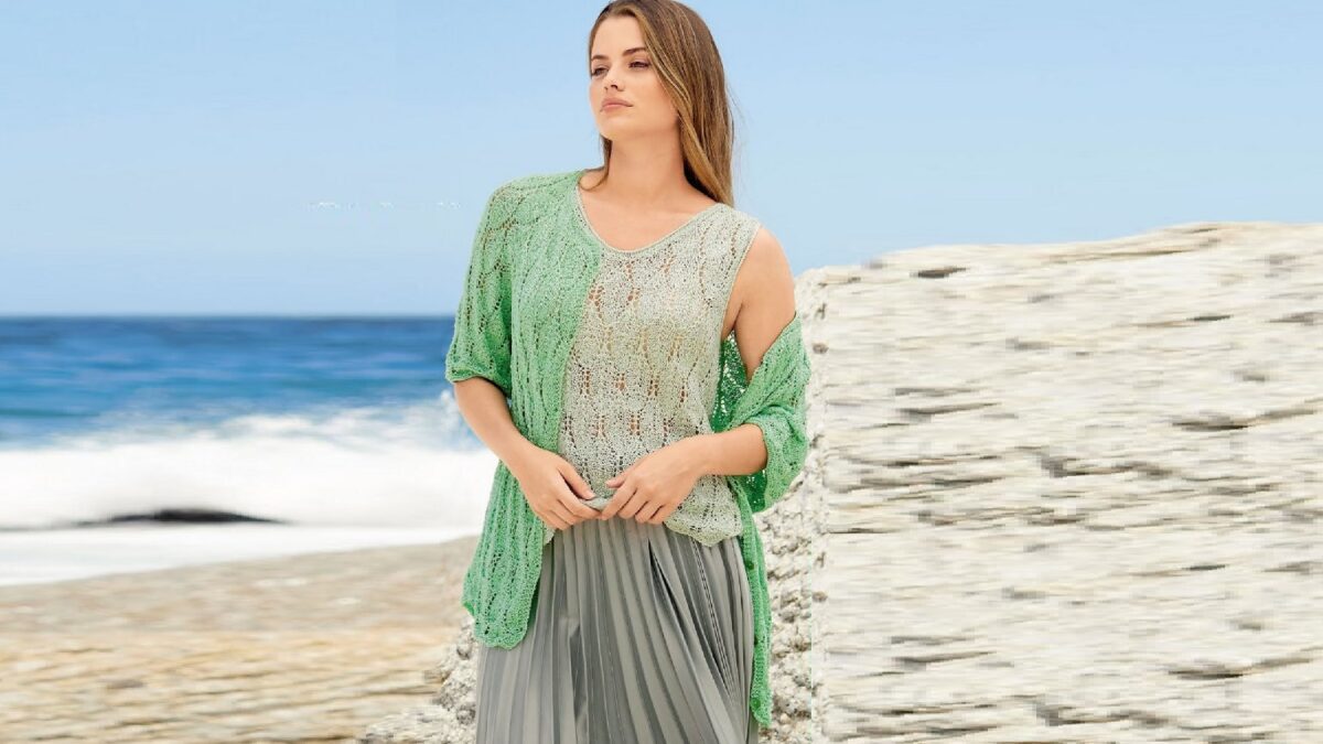 The set of top and jacket is made of light cotton-viscose yarn. Both models captivate with an all-over openwork pattern and various shades of green - from light for the top and darker for the jacket