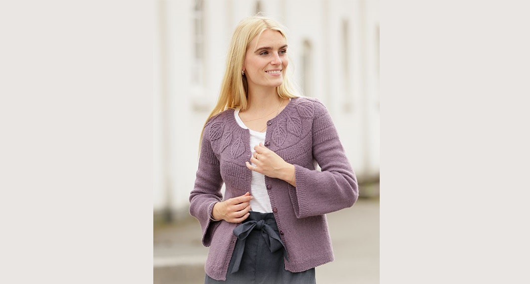 Knitted jacket made from DROPS Flora yarn. The product is knitted from top to bottom with a round yoke, a leaf pattern, and a fluffy English rib.