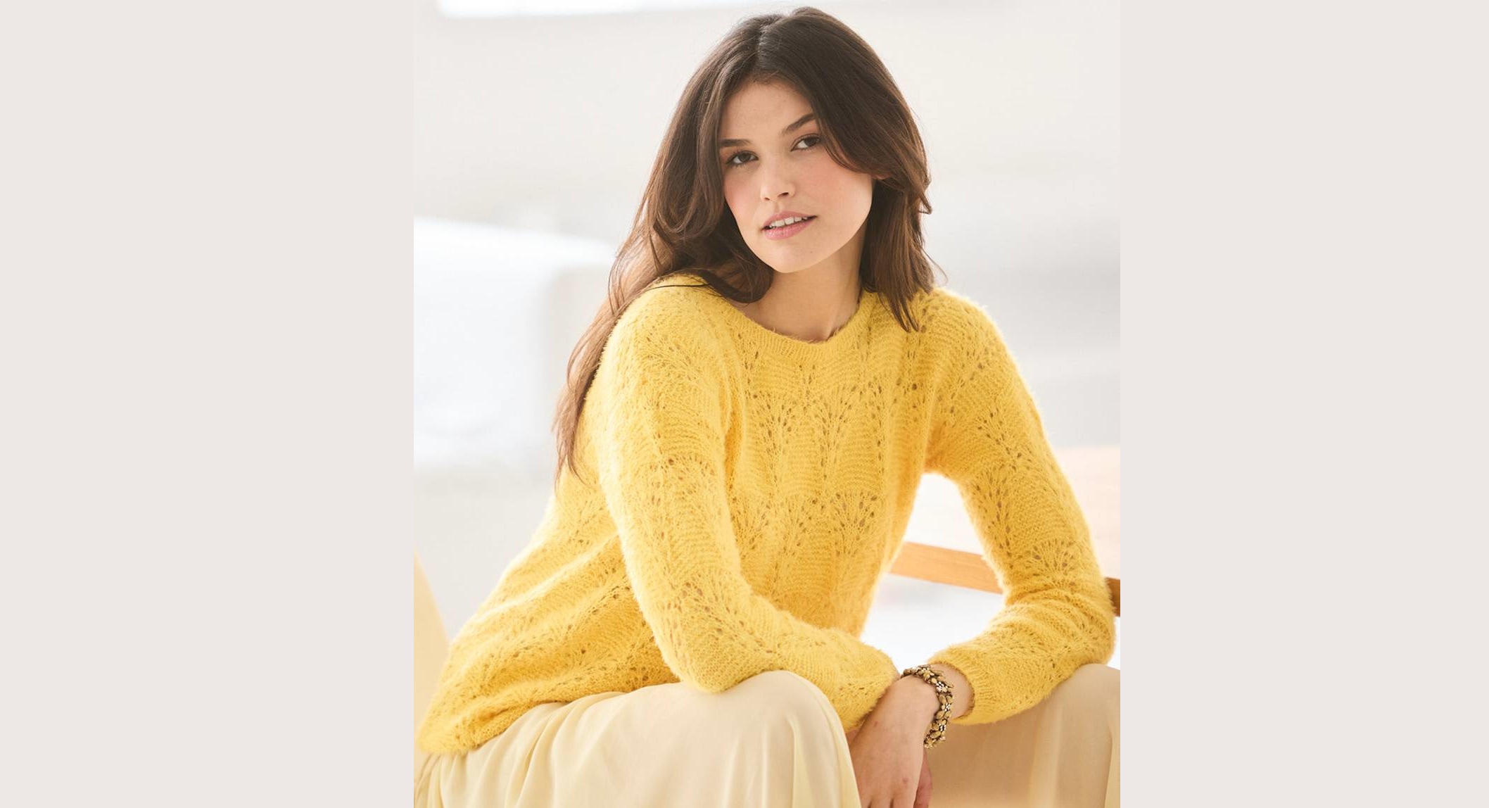 Солнечно-желтый ажурный пуловер прямого силуэта не только ослепительно красив, но и приятен для кожи. Это заслуга мягкой, слегка ворсистой пряжи, идеальной для межсезонья.
