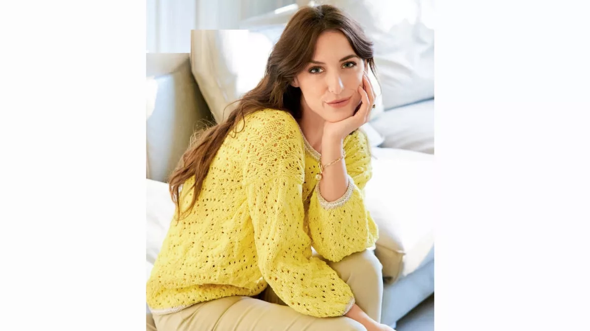 Удобный пуловер длиной до бедер с ажурными «зигзагами» сияет словно солнце! Края окантованы узкими полосками платочной вязки попеременно песочной и сливочно-белой нитями, что создает приятный контраст с желтым цветом.