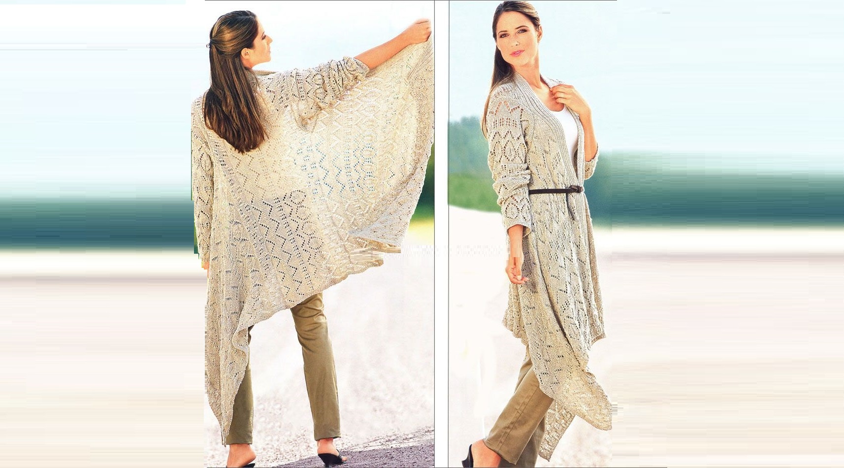 Sleeves. Набрать 51 (55) п. и связать 1,5 см резинкой 1х1, далее вязать между кром. ажурным узором, начиная с 19-го ряда схемы и в 1-м р. равномерно прибавить 2 п. = 53 (57) п.