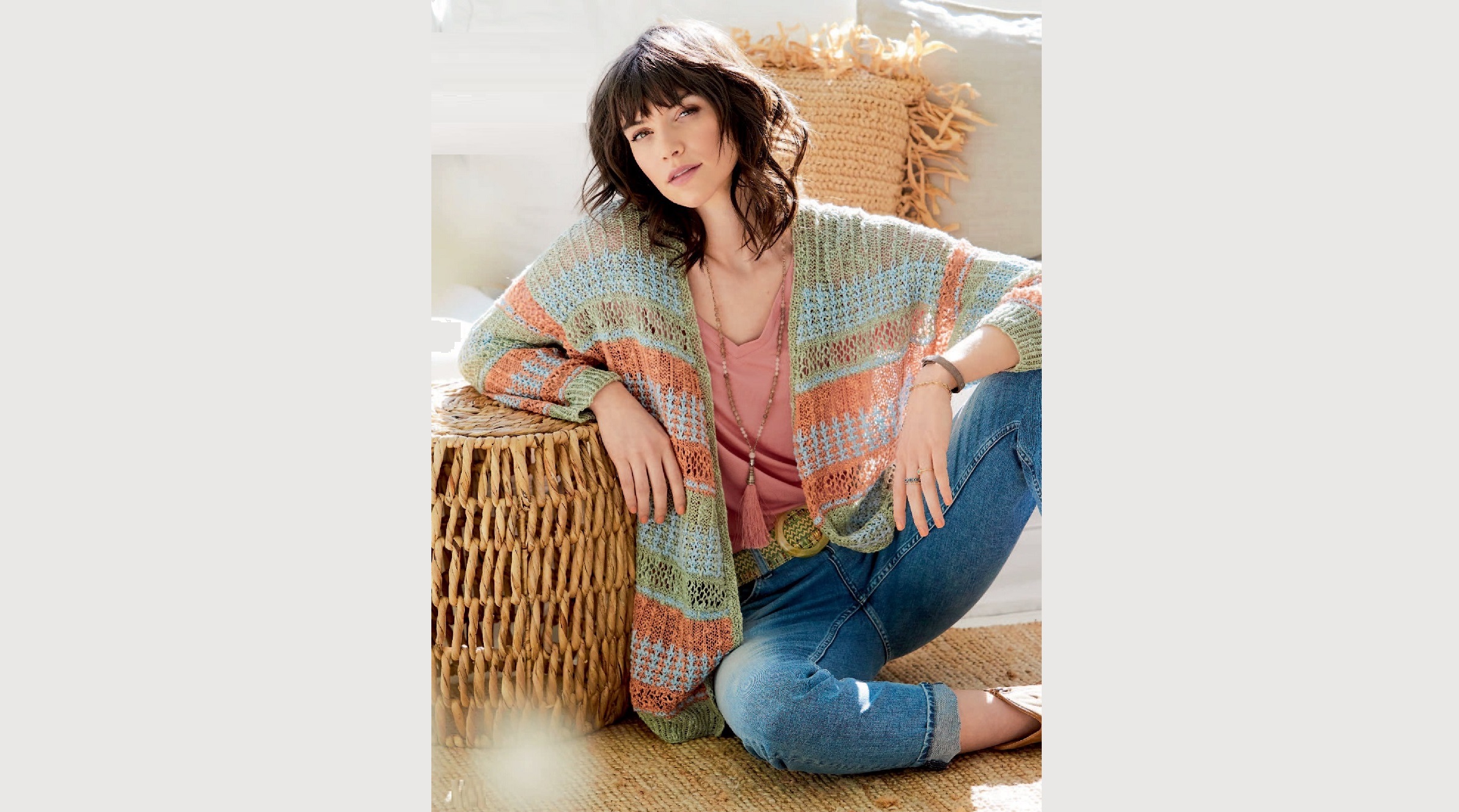 Легкий и свободный, мягко ниспадающий кардиган, связанный узором из снятых петель и трехцветными полосками, меняющими направление на рукавах будет хорошо смотреться с джинсовыми комбипартнерами.
