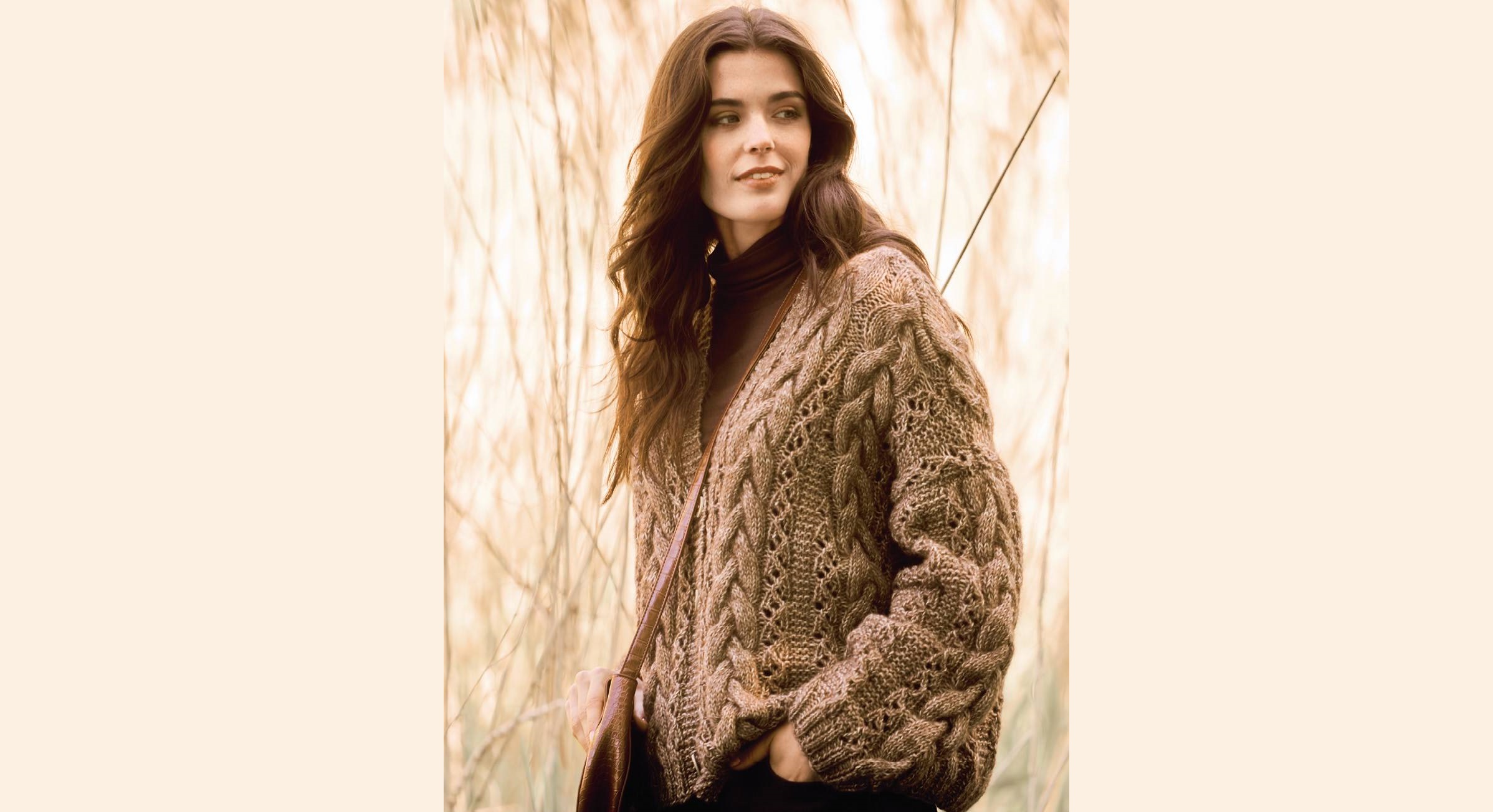 Меланжевый кардиган оверсайз с широкими объемными «косами» кажется грубоватым, но ажурные вставки и мягкая пряжа из хлопка и шерсти альпака делают его легким и приятным на ощупь.