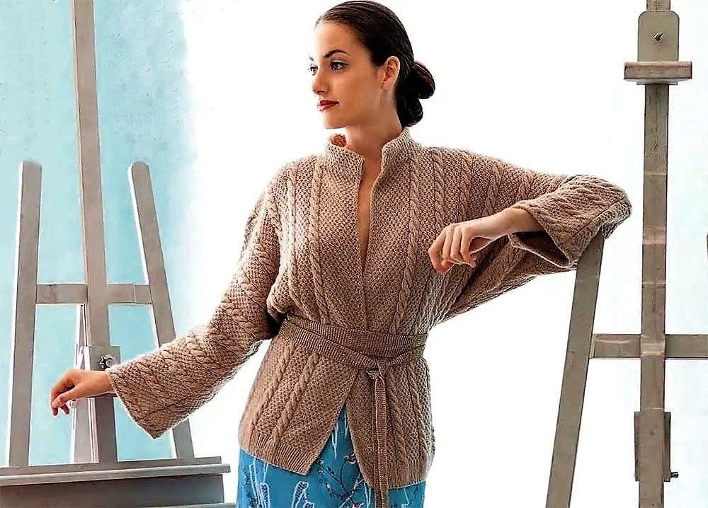 Необычного фасона связанный спицами кардиган с цельновязанными рукавами летучая мышь со строгим воротником, вытягивающими силуэт вертикальными косами получается универсальным