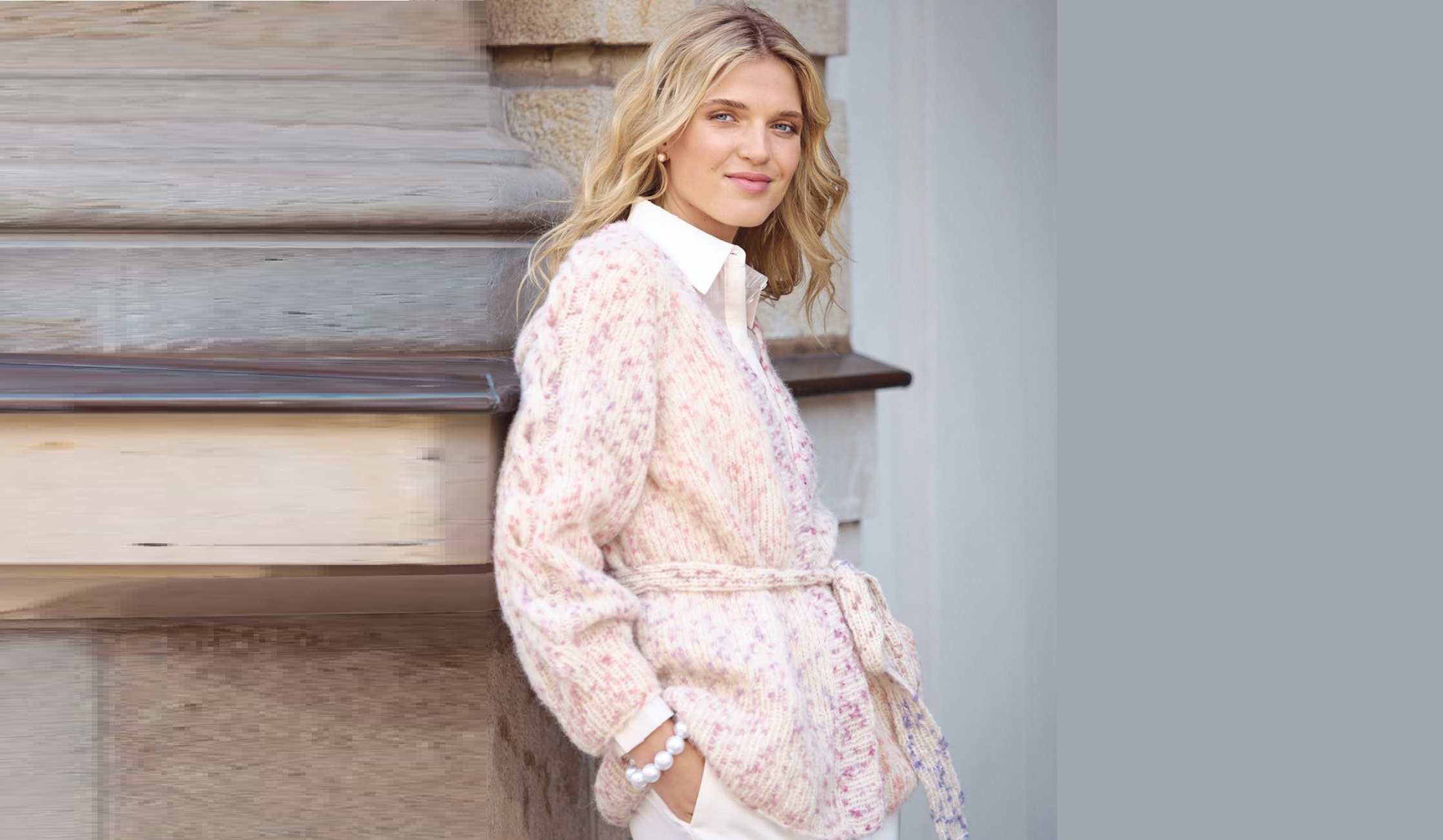 Изящное решение: свободный кардиган с завязывающимся поясом очаровывает женственными «косами» вдоль рукавов реглан. Принтованная пряжа в розово-сиреневых тонах добавляет динамики и немного интриги.