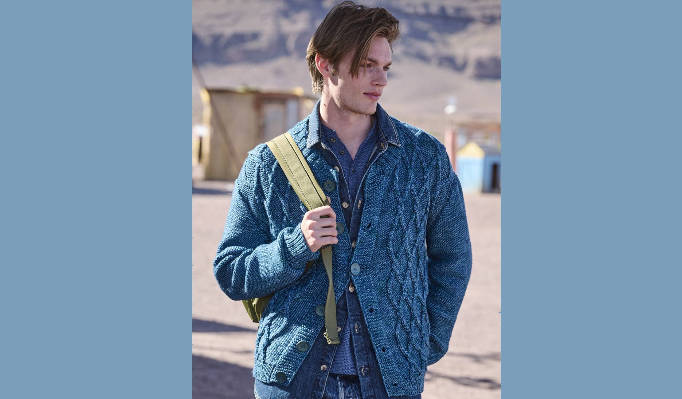 И просто, и стильно: спинка и полочки декорированы рельефными ромбами, а рукава быстро вяжутся изнаночной гладью — в результате получается модный мужской кардиган одного из оттенков денима. Меланжевая пряжа придает полотну глубину и характерную неровность цвета.