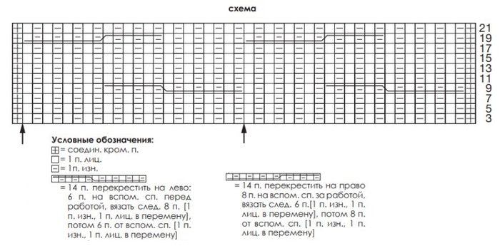 Резинка с косами: вязать по схеме. Цифрами с правого внешнего края обозначены лиц. р. В изн. рядах провязывать петли по рисунку. В ширину начать с петель перед 1-й стрелкой, 22 п. раппорта между стрелками постоянно повторять, закончить петлями после 2-й стрелки. В высоту выполнить 3–22 р. 1х, затем эти 20 р. постоянно повторять.