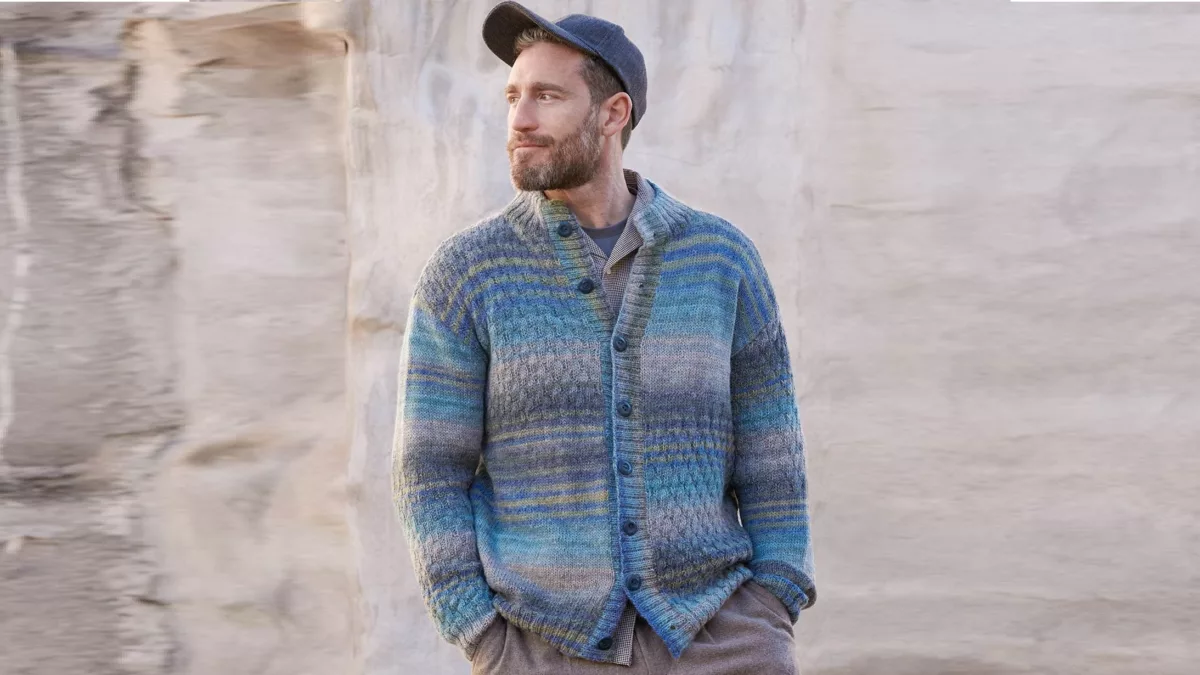 Теплая прочная пряжа из шерсти альпака суперфайн и полиамида окрашена короткими секциями. При вязании лицевой гладью они превращаются в симпатичные узкие полоски, а диагональный рельефный узор добавляет им объема. Не выходящий из моды прямой фасон дополнен по краям широкими планками в резинку. Чудесное приобретение для мужского гардероба!