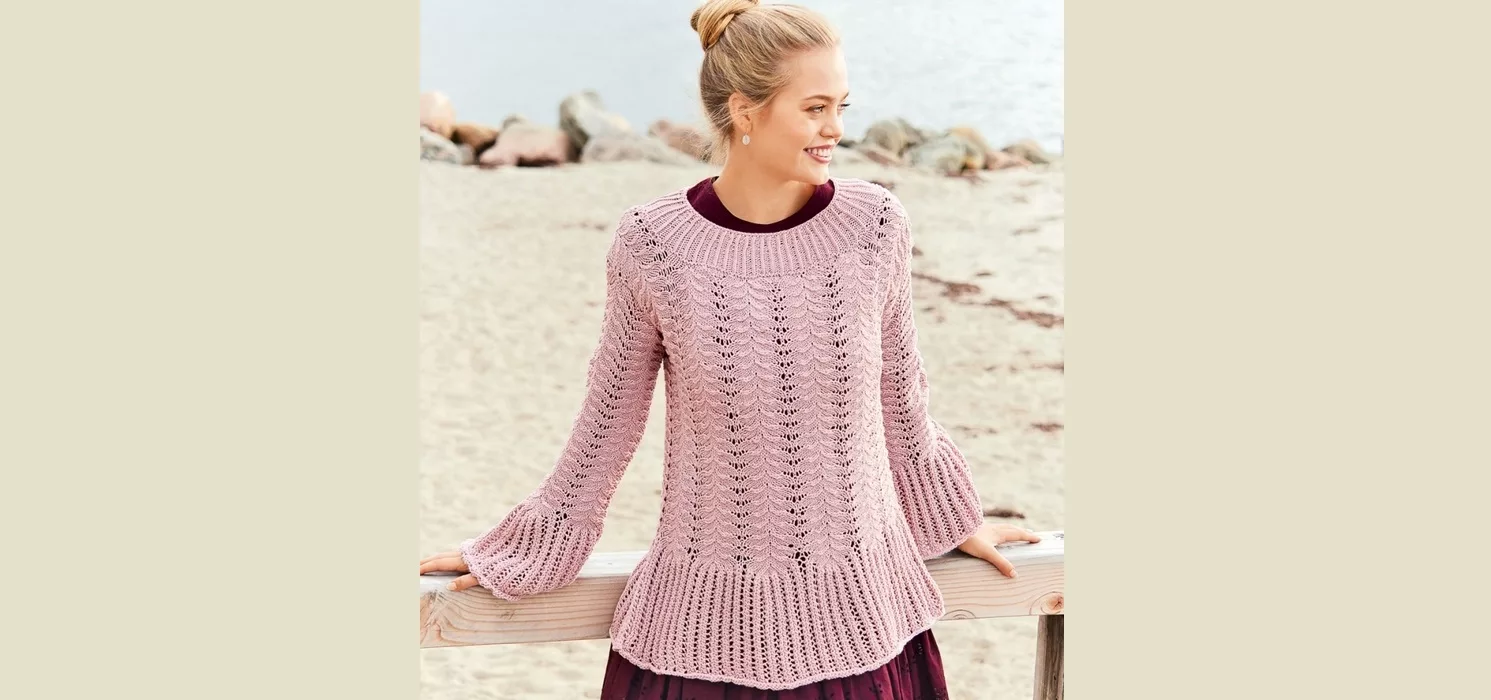 Свободные струящиеся силуэты актуальны в этом сезоне. Отличный пример: розовый джемпер с широкими воланами и кружевным узором.