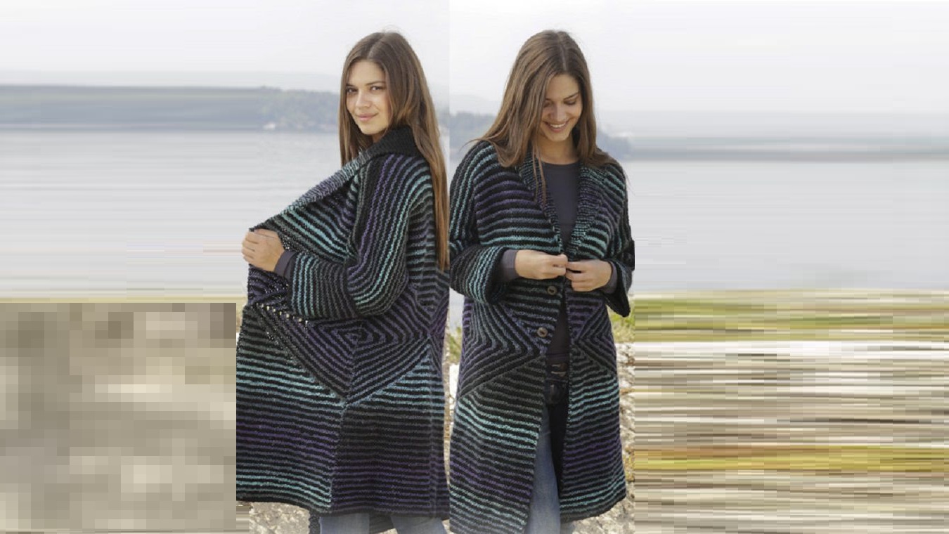 Пальто Northern Lights («Северное Сияние») из пряжи двух цветов платочной вязкой.