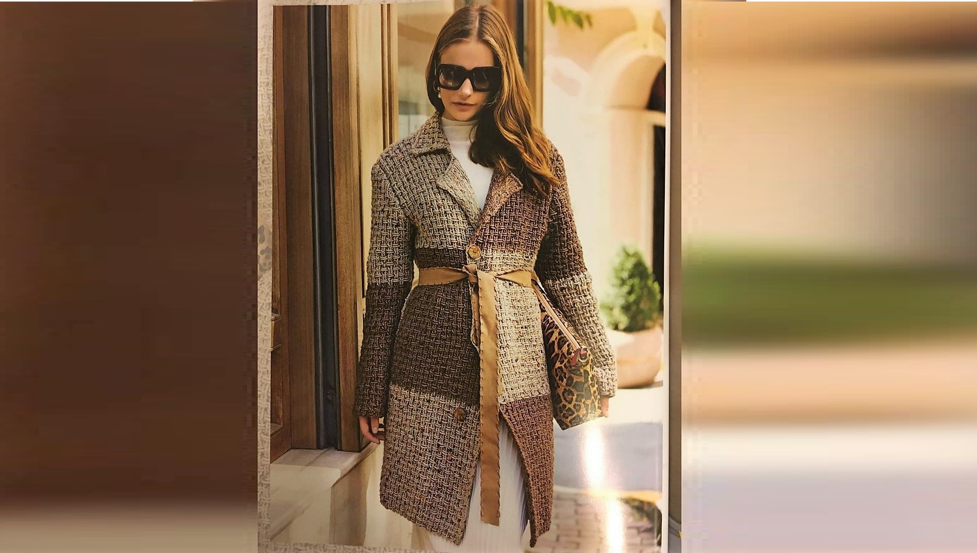 Двухцветное пальто спицами из акрила выполнено узором с перетяжками