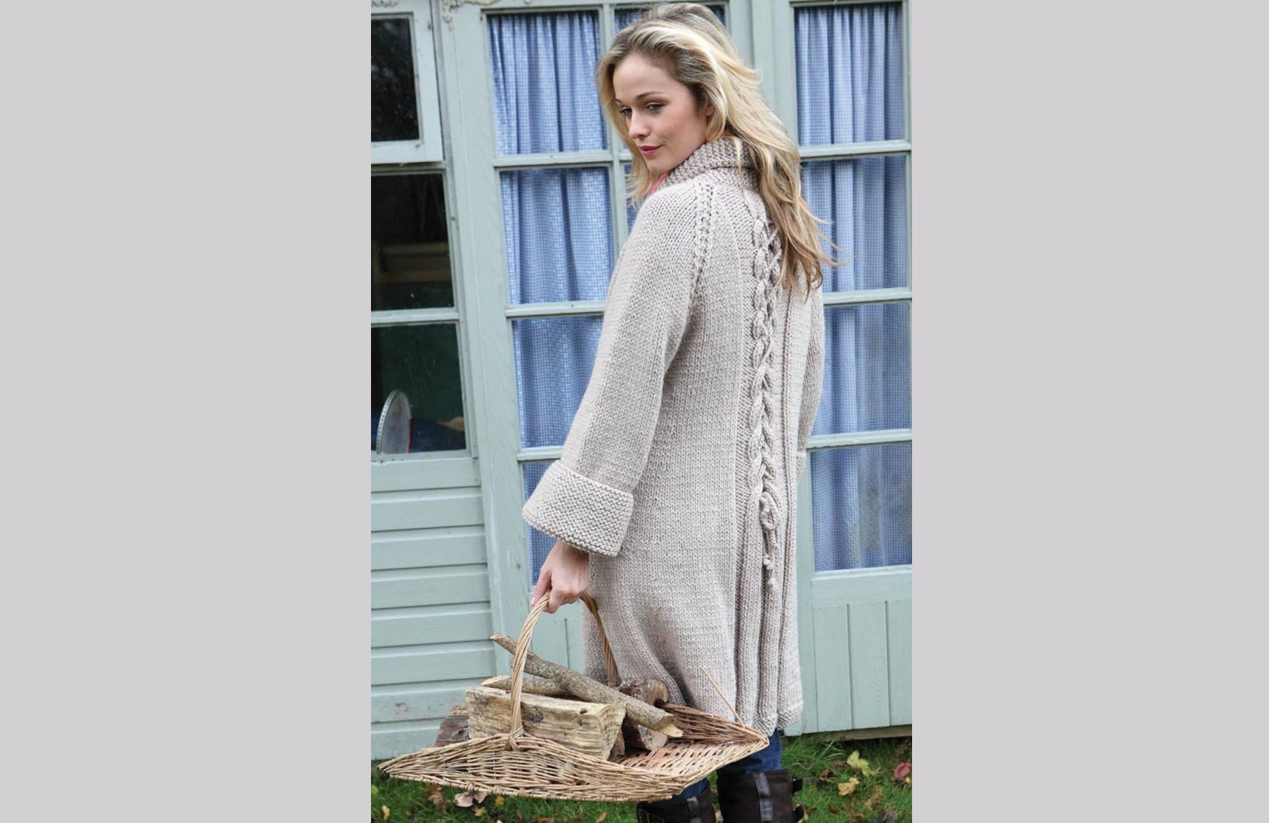 Описание вязания пальто с рукавами реглан и оригинальными косами со шнуровкой на спине.
