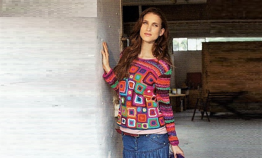 The combination of crocheted squares and knitted fabric results in a unique pullover...