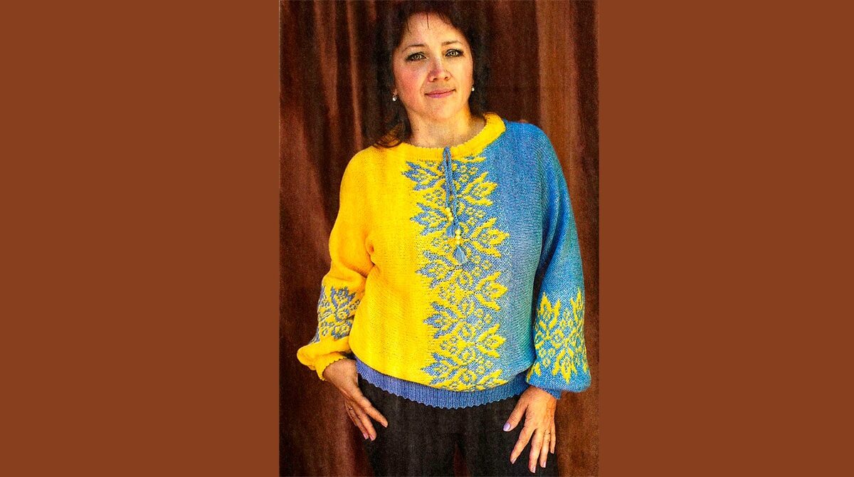Желтые тюльпаны на сером фоне, а серые – на желтом. Оригинальная идея, не правда ли? Пуловер вяжется в поперечном направлении от одного рукава к другому. Модные детали – широкие рукава с напуском, резинка с зубчиками и кулиска по вырезу горловины.