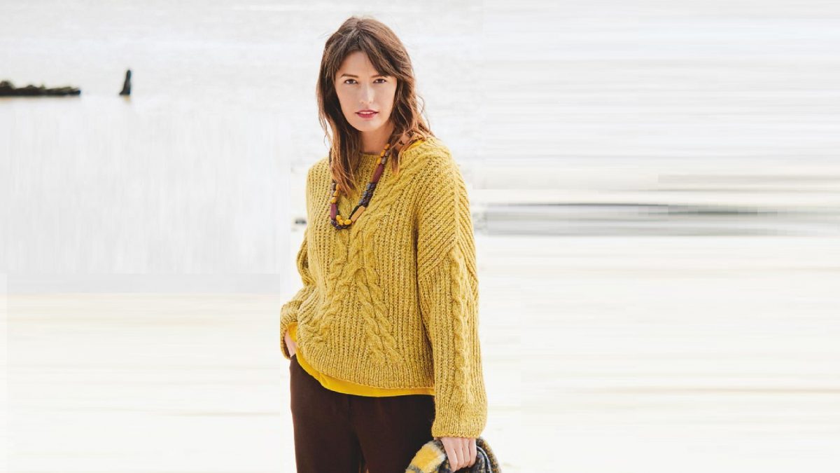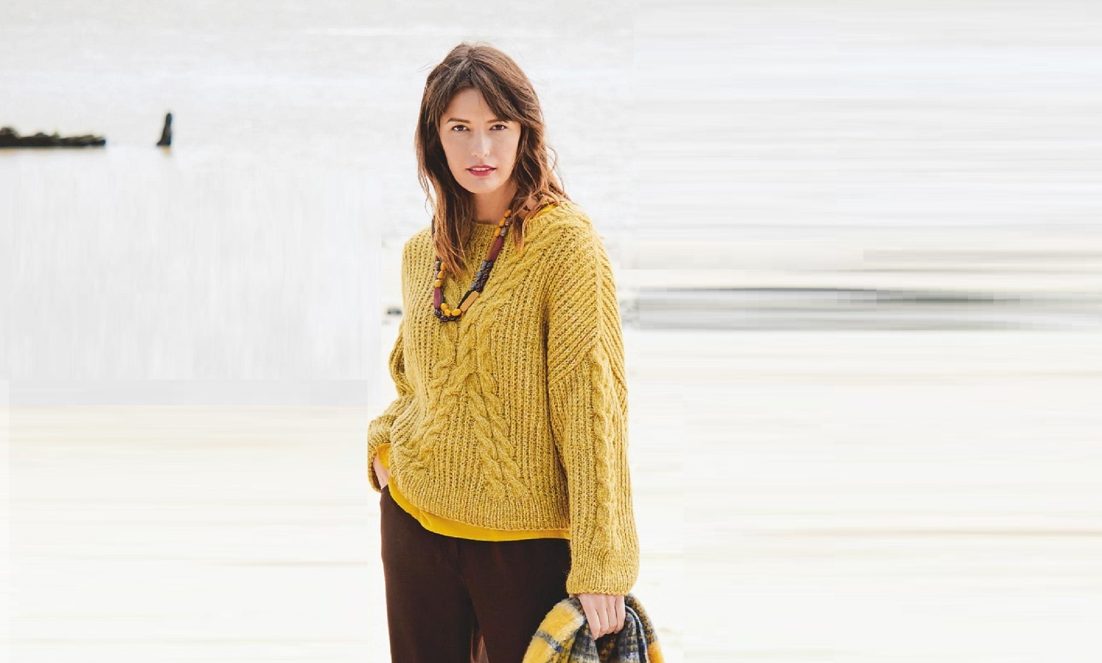 Вязаный пуловер оверсайз с Х-образными крупными «Косами» на фоне полу патентной резинки.