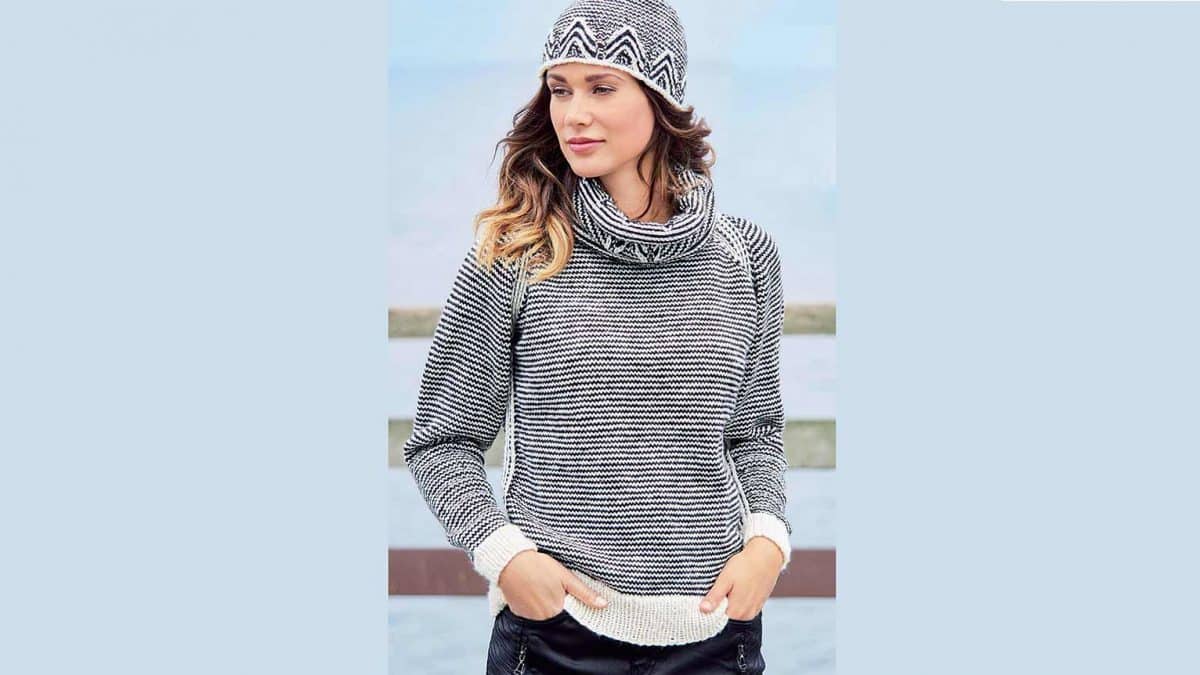 Рисунок в полоску всегда будет в моде. Черно-белые полоски и зигзагообразный узор по краю снуда и шапочки идеально подходят к друг другу. На пуловере регланные и боковые швы подчеркнуты белыми полосами. Этот комплект очень удачный!
