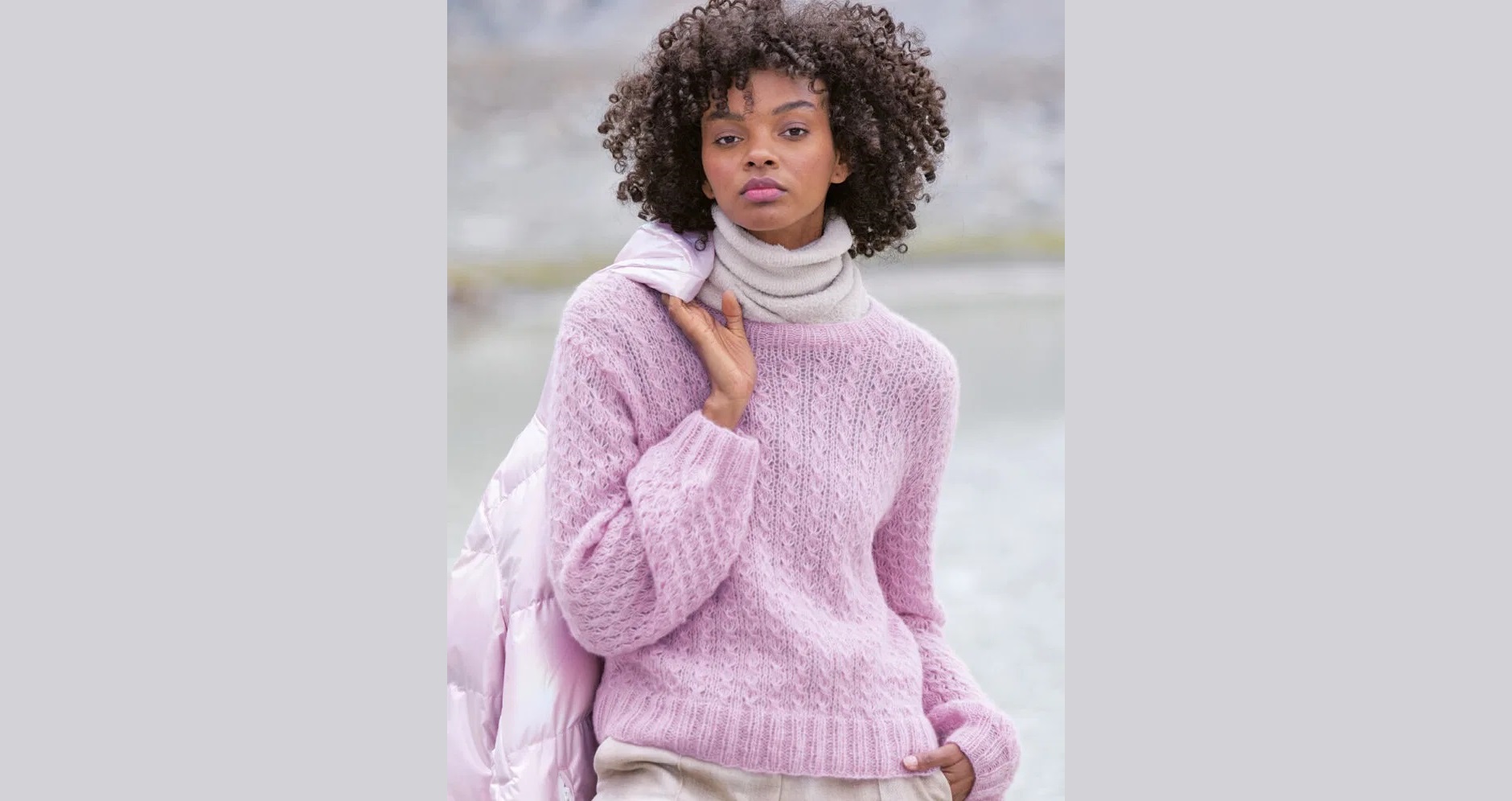 Основу этой модели, свободно сидящей на фигуре, составляет тонкая пряжа из мохера и шелка с добавлением шерсти яка. Здесь также соединяются нити двух близких оттенков -розового и сиреневого.