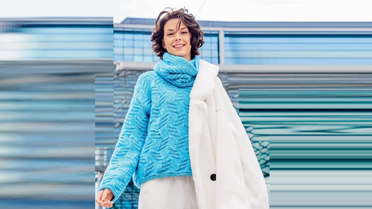 Структурный узор с диагональными рубчиками придает пуловеру динамичный, захватывающий вид. Так и хочется надеть его и поиграть в снежки!