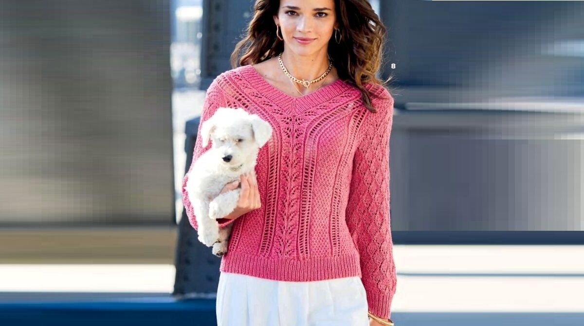 Сочетание ажурных и рельефных узоров на связанном спицами пуловере придает модели с V-образной горловиной особое очарование. Красивый ажурный пуловер отлично будет смотреться весной.