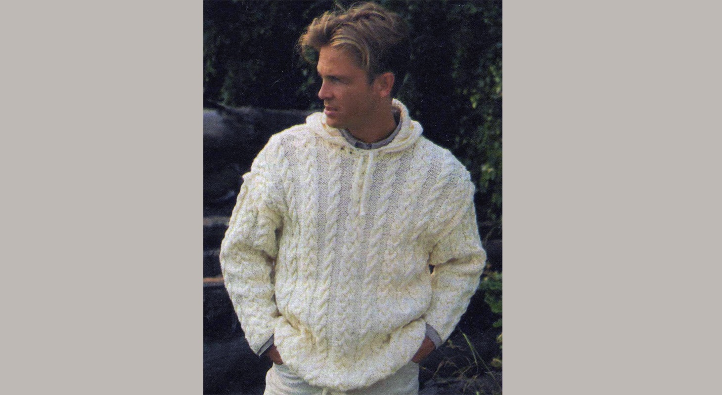 По краю горловины набрать на круговые спицы 90 (105) п. и вязать 5 р. резинкой, при этом кром. п. опустить. Затем в середине переда закрыть 5 п. и на оставшихся петлях вязать капюшон в прямом и обратном направлениях. Для этого в 1 -м р. между лиц. петлями резинки из протяжки вывязать по 1 лиц. скрещенной петле и затем вязать попеременно 3 изн., 3 лиц. петли.