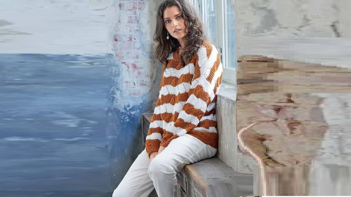 Патентные петли и широкие полоски придают пуловеру спортивную нотку. Эта универсальная модель в комплекте с белыми брюками и кроссовками будет радовать вас не один сезон.