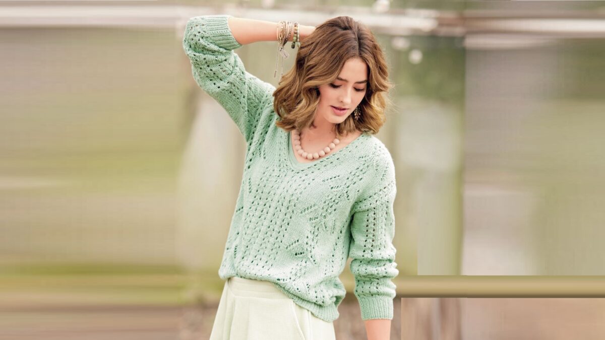 Мятно-зеленый пуловер с V-образным вырезом из смеси хлопка, вискозы и льна оживляют крупные и более мелкие ажурные мотивы