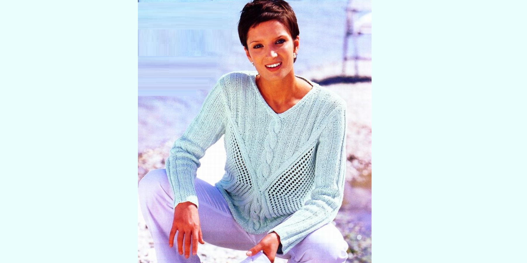 You will need: 600 g of Scooter mint yarn (64% cotton, 27% viscose, 9% polyamide, 85 m/50 g); knitting needles No. 4.5; hook No. 3.5.