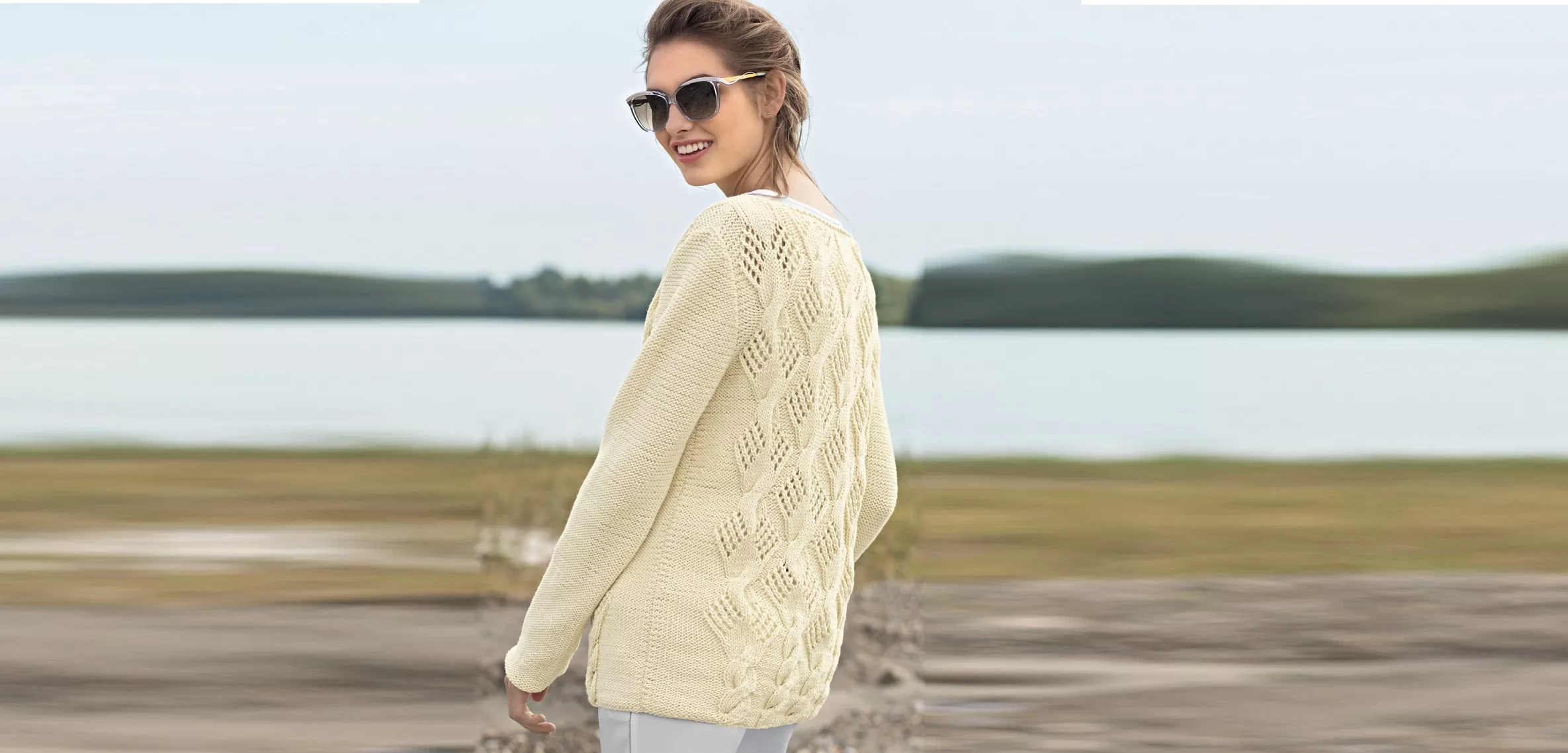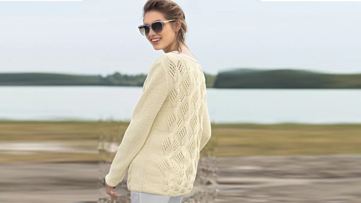 В пуловере прямого покроя акцент сделан на ажурные «косы», которые особенно хороши в сочетании с ванильно-желтой пряжей из хлопка и шерсти