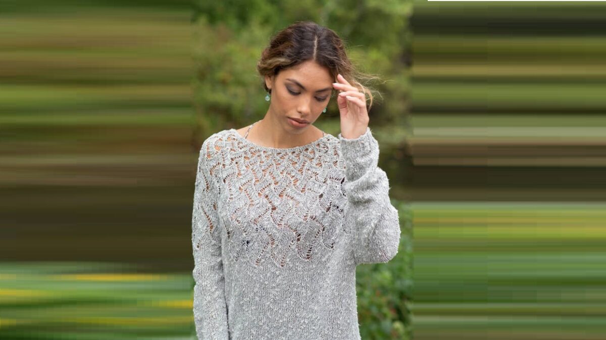 Чудесная модель пуловера от Berroco с круглой ажурной кокеткой для женщин, связанная на спицах 4 мм из летней хлопковой пряжи. Сначала вяжутся рукава и основная деталь по кругу чулочной вязкой, далее выполняется кокетка по приведенной в описании схеме ажурного волнистого узора. Перед тем как вязать узор, необходимо выполнить несколько рядов частичного вязания для ростка.