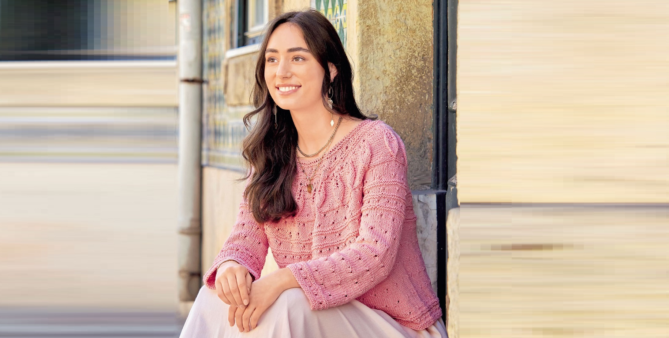 A spacious pink pullover is knitted from top to bottom with a single fabric, and on the yoke there are alternating stripes of garter stitch, openwork and decorative “leaves”.