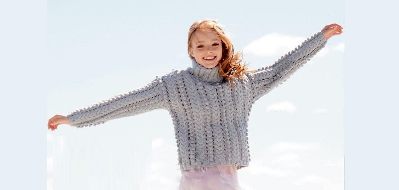 Для воротника гольф набрать на круговые спицы № 3,5 по краю горловины 114 (120) петель и вязать ажурным узором 2 круговыми рядами.