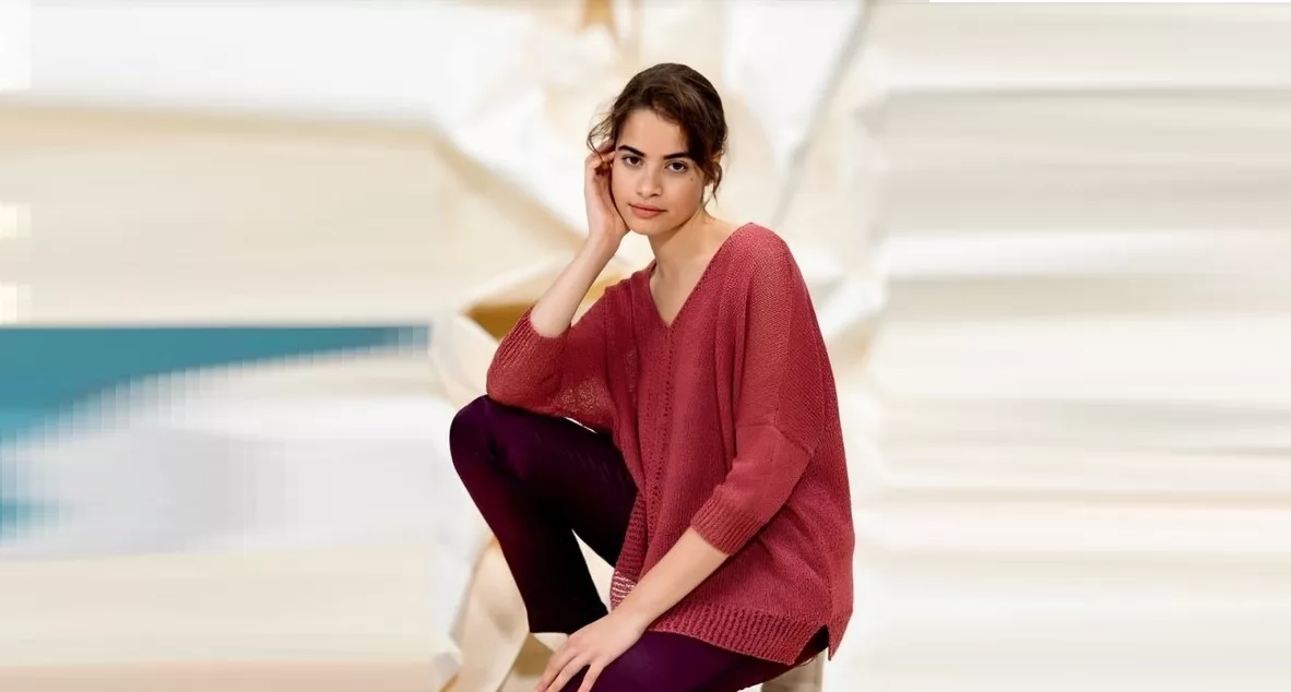 Комфорт пуловера с V-образным вырезом горловины подчеркнут силуэтом оверсайз, небольшими боковыми разрезами, тонкой пряжей из натурального льна. Модель выполнена обычной лицевой гладью, середина переда украшена элегантной ажурной дорожкой