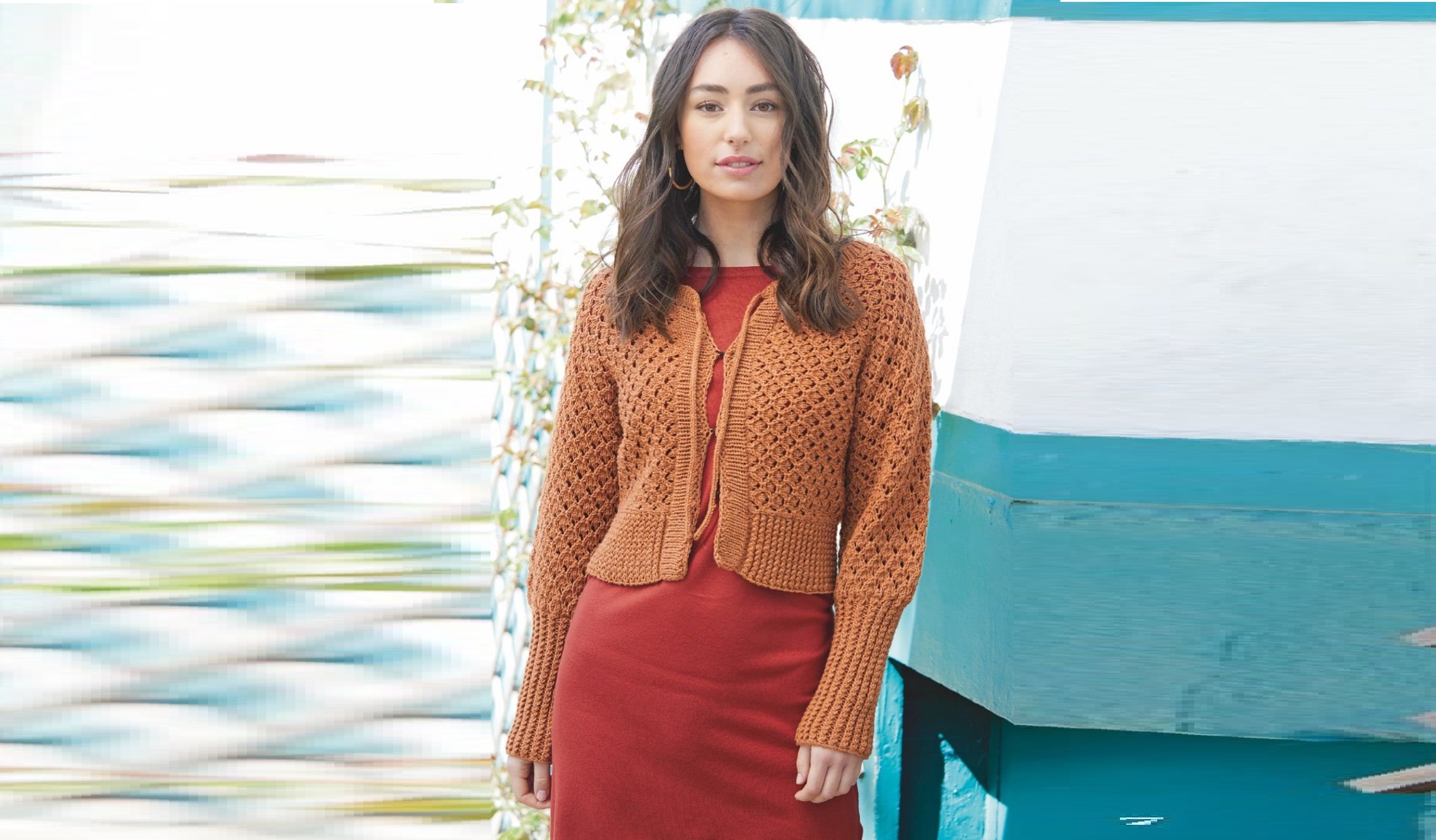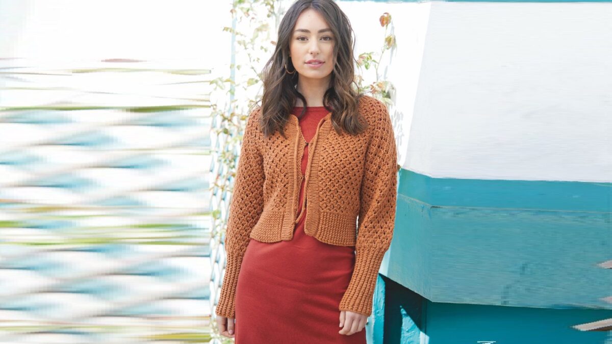 Коротко и ясно: связанный поперек жакет отлично смотрится с платьями, широкая планка удачно подчеркивает талию.