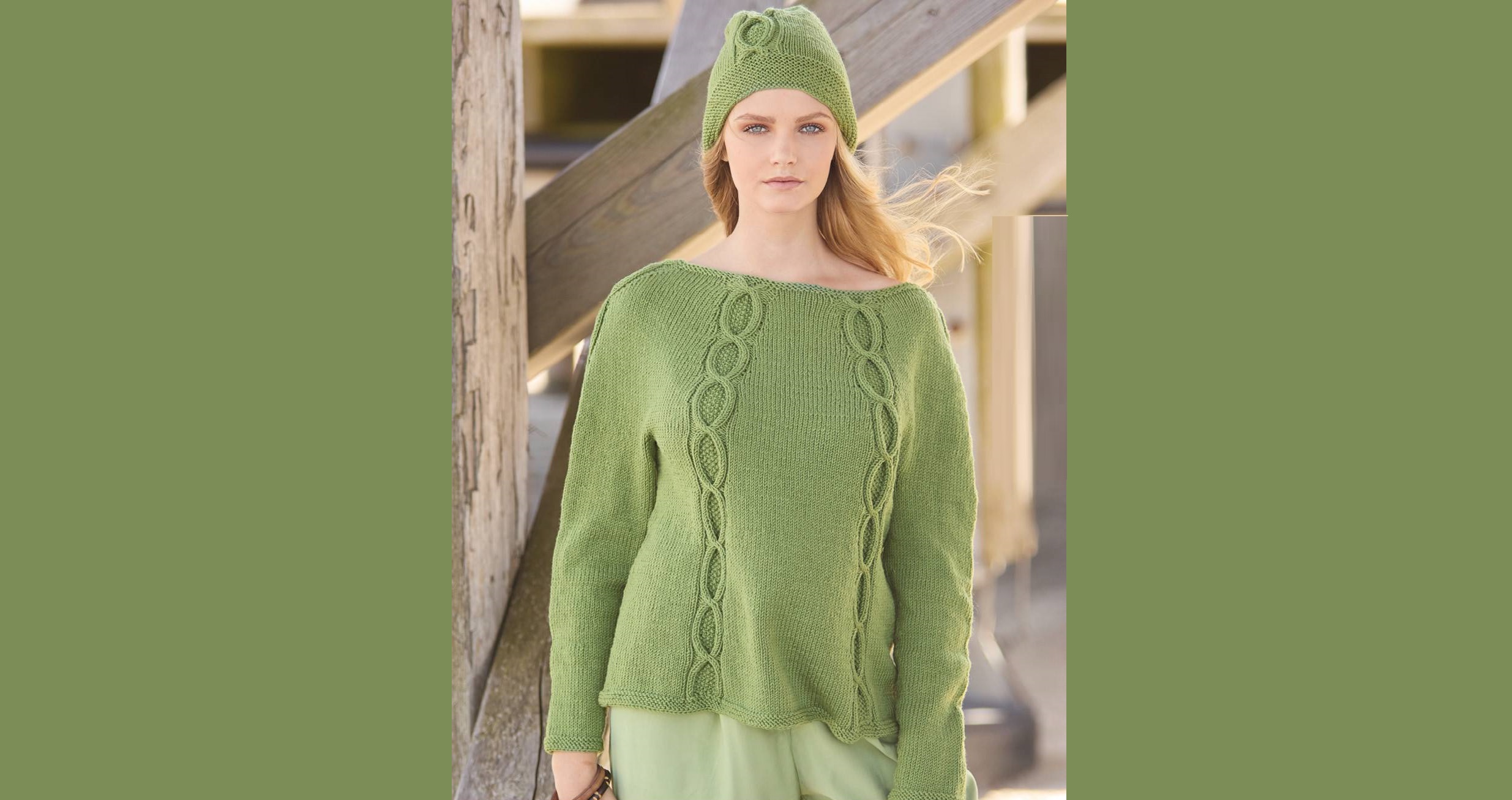 Пуловер с одиночными «косами» в виде цепочек вяжется по кругу сверху вниз. Благодаря тщательно выполненным прибавкам на плечах, переде и спинке образуется женственный А-силуэт. Подходящая шапка завершает этот лаконичный, но очень стильный образ.