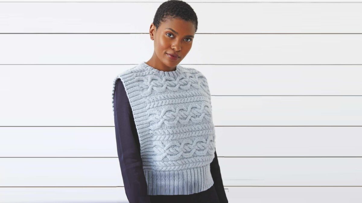 The silver-gray sleeveless vest features deep armholes and is knitted crosswise and features stunning braids.