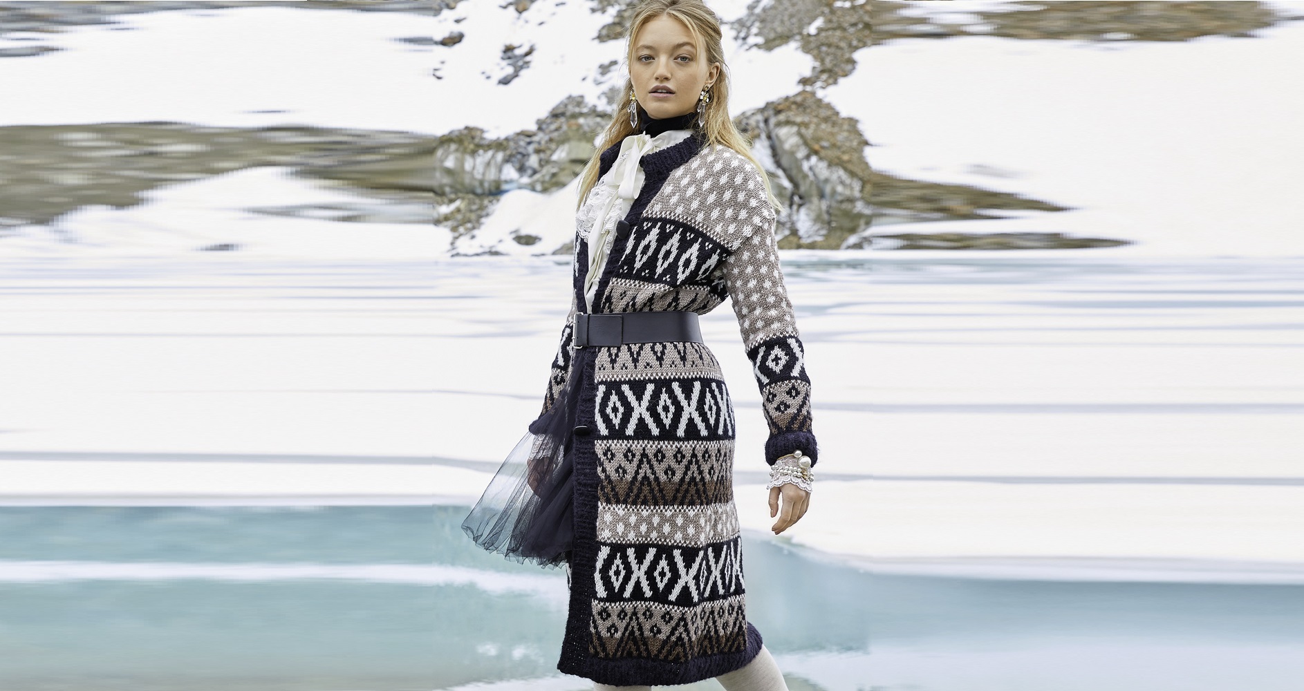 Пальто из уютной шерстяной пряжи, с сочетанием жаккардовых узоров, актуальной длины миди и