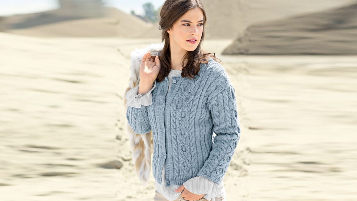 A new look for a classic: ice-blue yarn with cashmere, original “braids” and matching buttons – elegant and not at all boring!