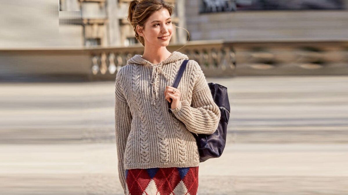 Пряжа (70% натуральной шерсти, 30% шерсти альпака; 112 м/50 г) — 700 (750) 800 г песочной; спицы №4 и 5; круговые спицы №5.