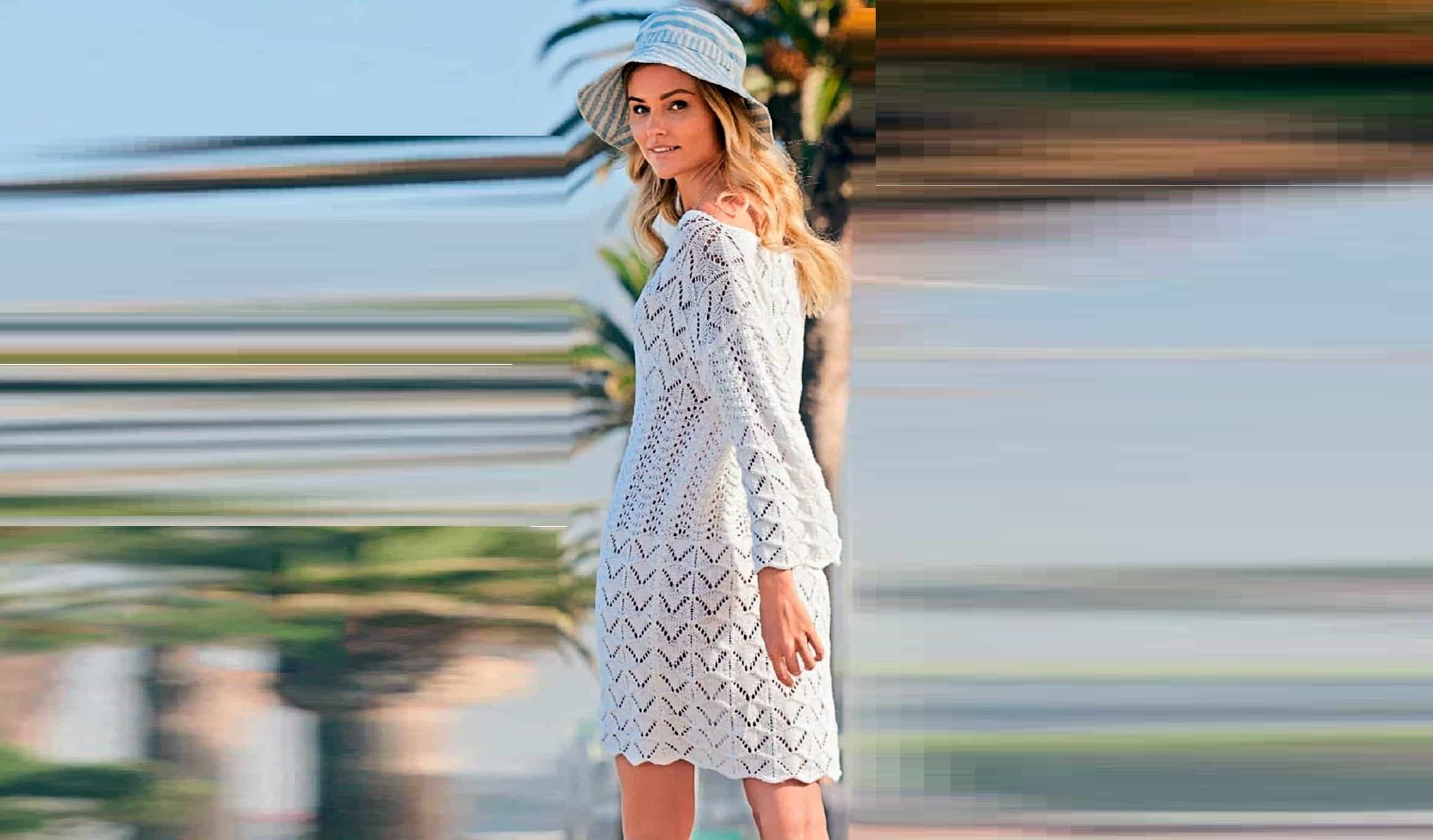 Чудесное вязаное платье белого цвета с приспущенными проймами никого не оставит равнодушным. Чередование спиц разного размера, а также сочетание крупного ажурного узора с широкими вставками другой волнистой структуры создает великолепный приталенный силуэт.