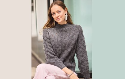 Когда превосходная пряжа из вискозы хлопка и льна украшена нитью с пайетками, даже повседневный пуловер с-V вырезом выглядит впечатляюще. Не последнюю роль здесь играют и переплетения «кос», дополненные поперечным ребристым узором.