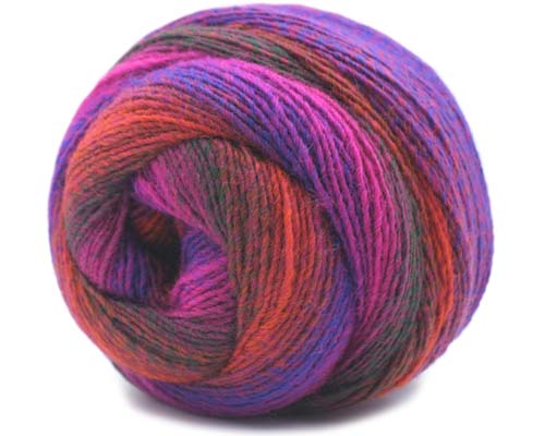 Для вязания нам потребуется 400 (400) 600 г пряжи секционного крашения в оранжево-коричнево-лиловых тонах (цвет № 408) Lana Grossa “Gomitolo Versione”:(50% натуральная шерсть, 50% полиакрил; 700 м/200 г.