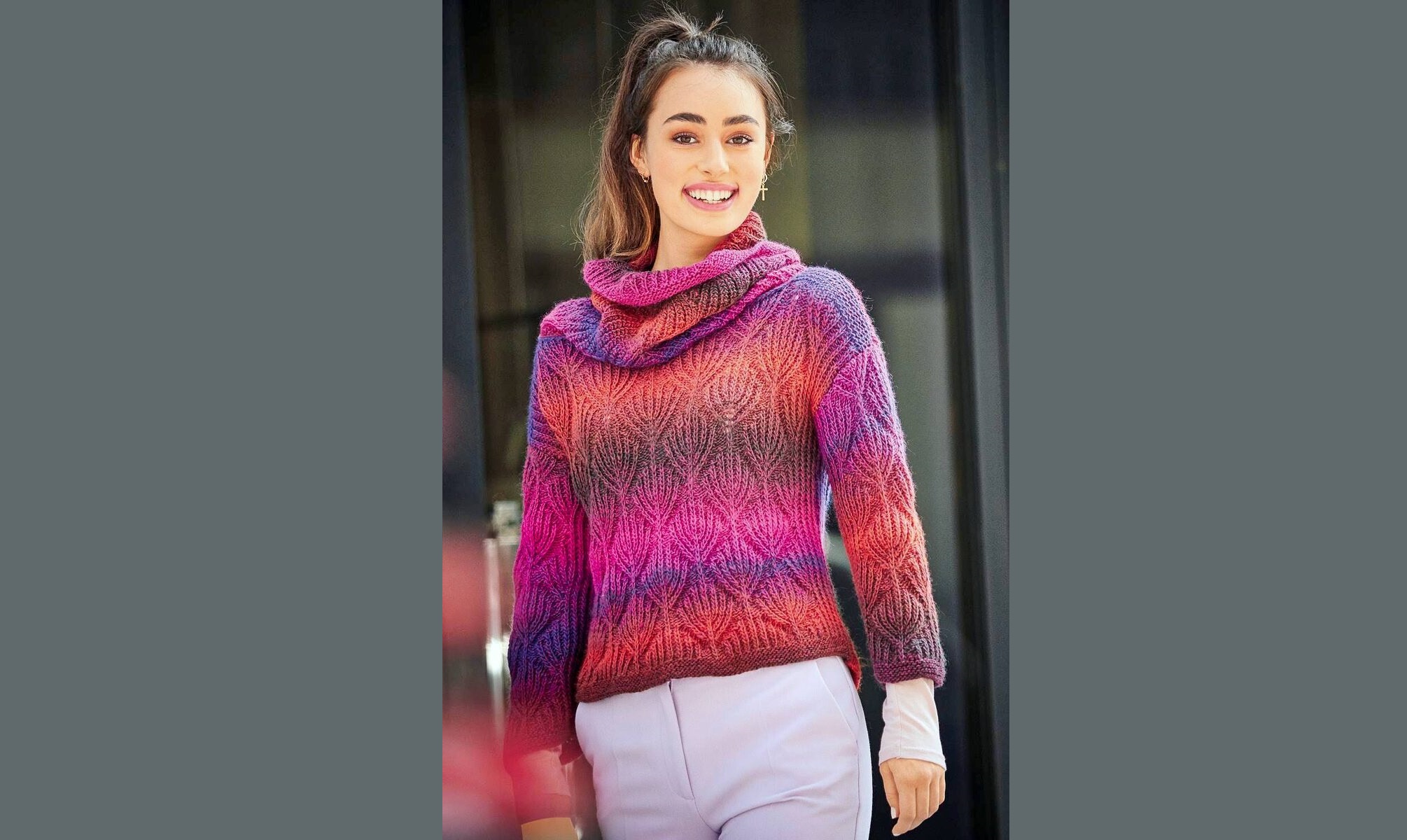 Патентные структуры триумфально возвращаются в моду. Здесь прибавки и убавки петель создают динамичный узор в виде ромбов, эффектно подчеркнутый оттенками розового и оранжевого.