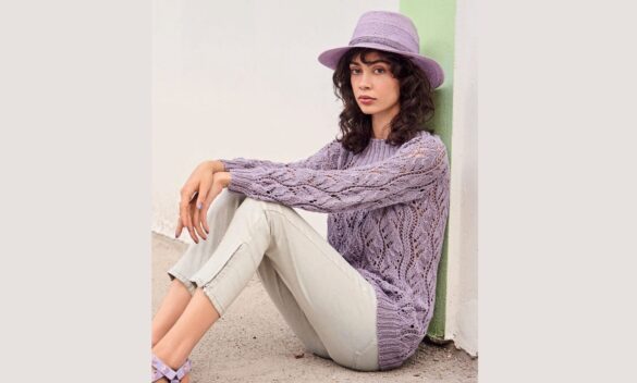 Благодаря тонким пушистым ниткам из мохера и шелка классический пуловер с 7-вырезом получается легким как перышко и удивительно нежным. Модель также отличается продуманным дизайном: регулярные прибавки по центру и убавки по краям обеспечивают У-образное расположение узора на всех деталях.