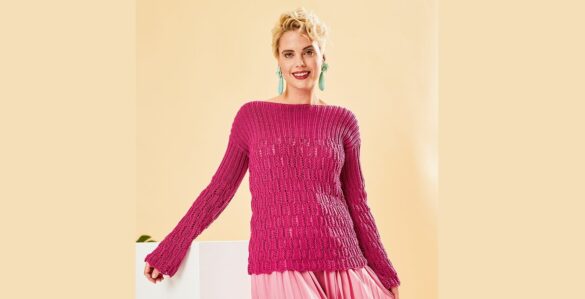 У этого пуловера с круглой узорчатой кокеткой и короткими рукавами обе стороны совершенно одинаковы. Модель вяжется сверху вниз единой деталью. Пряжа с цепочной структурой из хлопка и полиамида делает полотно объемным, но в то же время легким.
