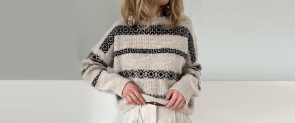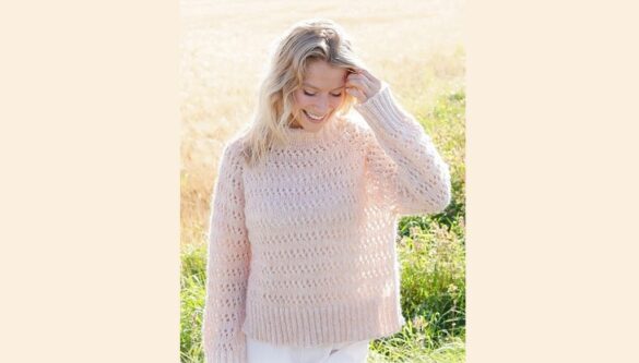 В этом пуловере натуральные льняные волокна также играют главную роль: благодаря им вязание идет как по маслу, а различные узоры получаются особенно выразительными. Слегка покатая линия плеч и широкие полосы резинки по краям обеспечивают хорошую посадку изделия на фигуре